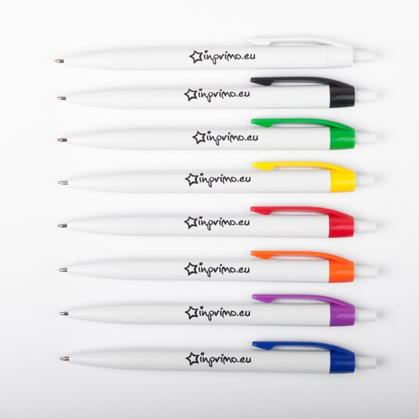 Poszukujących prostej, nowoczesnej stylistyki proponujemy model długopisu Netto. Biały, gładki oraz prosty korpus stanowi doskonałe tło dla nadruku reklamowego w każdym kolorze. Uzupełnieniem całości jest klips dostępny w przyciągających wzrok, intensywnych barwach, które podkreślają dowolny nadruk reklamowy.