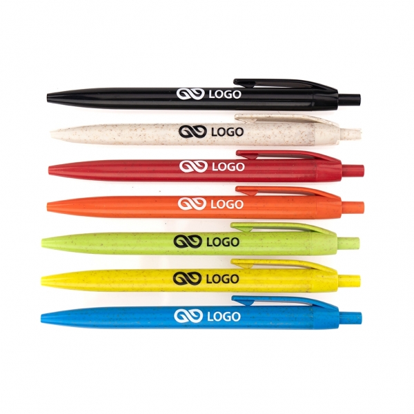 Waga: 6,8 g / Długość: 138 mm / Rozmiar nadruku: 55 x 7 mm / Typ wkładu: Slim - wymienny / Kolor wkładu: niebieski / Odblokowanie wkładu: wciśnięcie / Tworzywo: słoma pszeniczna / Opakowanie: 100 szt. / Kolor: do wyboru (niebieski, czarny, zielony, czerwony, pomarańczowy, żółty, beżowy) /