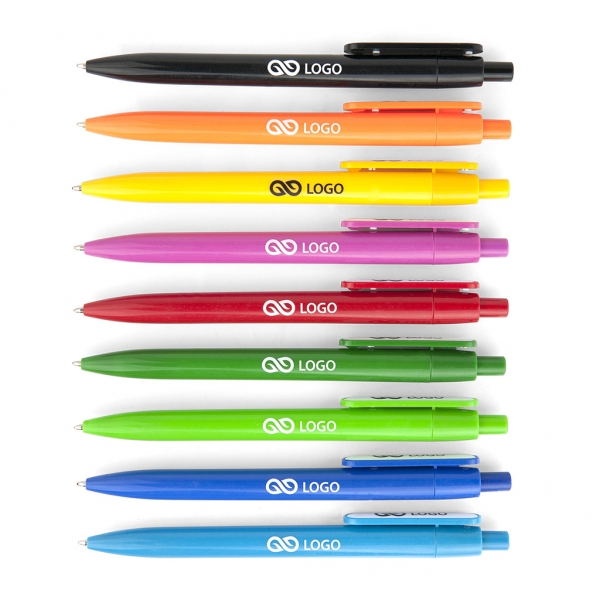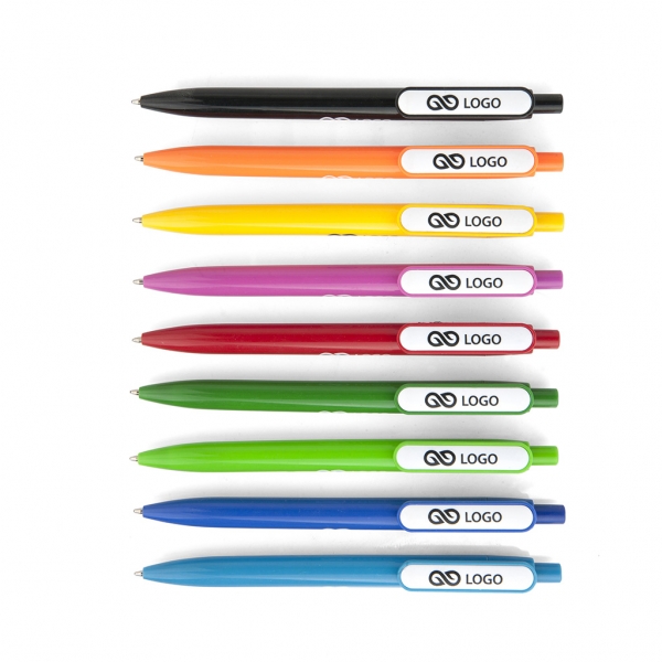 Waga: 8 g / Długość: 136 mm / Rozmiar nadruku: korpus 55 x 7 mm, klips 30 x5 mm / Typ wkładu: Slim - wymienny / Kolor wkładu: niebieski / Odblokowanie wkładu: wciśnięcie / Tworzywo: ABS, Frosty / Opakowanie: 100 szt. / Kolor: do wyboru (czarny, zielony, pomarańczowy, jasny zielony, jasny niebieski, żółty, różowy, czerwony, niebieski) /