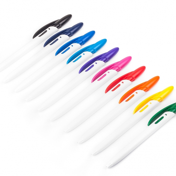 Biały korpus tego modelu, wykonany z pełnego, nieprzezroczystego plastiku jest doskonałym podłożem dla dowolnego nadruku reklamowego. Aby jednak zerwać z rutyną górna część korpusu, stanowiąca jednocześnie mechanizm przyciskowy, płynnie zlewająca się z zaokrąglonym klipsem, wykonana jest z plastiku w nasyconych barwach. Kontrast bieli oraz pełnych wyrazistości barw daje nowoczesną aranżację klasycznej formy, czym przyciąga uwagę do umieszczonego na korpusie znakowania.