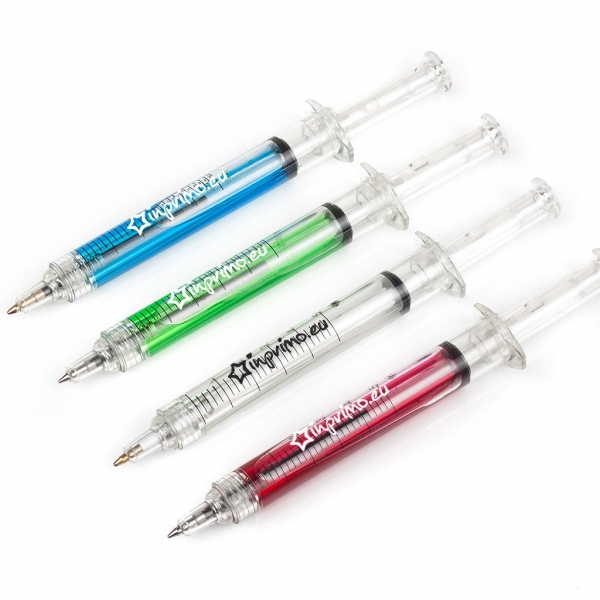 Jeżeli pośród najbardziej typowych gadżetów reklamowych, jakimi są długopisy, poszukujecie czegoś niezwykłego, oferujemy Państwu model, który niejednego przyprawi o skok ciśnienia. Gadżetem tym jest długopis do złudzenia przypominający lekarską strzykawkę. Od oryginały różni go to, iż zamiast igły posiada zwykły wkład uruchamiany mechanizmem przyciskowym. Dla wzmocnienia efektu długopis wypełniony jest kolorową cieczą, na tle której efektownie będzie prezentował się nadruk reklamowy. Gwarantujemy, że taka forma reklamy każdemu zapadnie w pamięć!