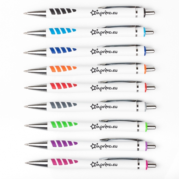 Pragniesz choć odrobiny dynamizmu w statycznej formie reklamy, jaką jest standardowy artykuł piśmienniczy z nadrukiem? Koniecznie przyjrzyj się bliżej modelowi Neptun. Jego z pozoru prosta linia korpusu, metalowy klips oraz srebrne wykończenia to klasyka. Jednak gumowe antypoślizgowe elementy wykonane w ciekawej formie, zaskakują intensywnością koloru. Nie sposób tego drobnego akceptu pominąć wzrokiem, a o przykucie uwagi odbiorcy przecież w reklamie idzie.