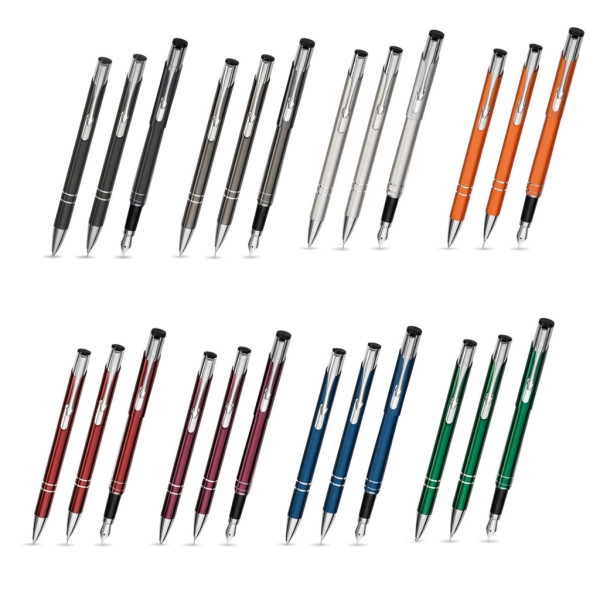 Zestaw 3 – elementowy Cosmo, w skład którego wchodzą: długopis, wieczne pióro oraz ołówek automatyczny może być eleganckim prezentem urodzinowym, jak również ładnym gadżetem reklamowym, po umieszczeniu na jego elementach nadruków reklamowych, wykonanych laserem. Niewielkich rozmiarów przybory wykonane są z aluminium, polakierowanego kolorowym lakierem, wybranym spośród wielu. Wymieniane wkłady we wszystkich przyborach, estetyczne opakowanie, powodują, że zestaw Cosmo może długo służyć użytkownikowi.