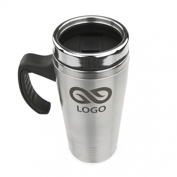 Waga: 230 g / Wysokość: 180 mm / Średnica: 80 mm / Rozmiar nadruku: 40 x 55 mm / Pojemność: 450 ml / Tworzywo: stal nierdzewna, plastik / Opakowanie: 10 szt. / Kolor: srebrny /