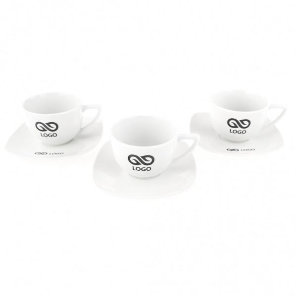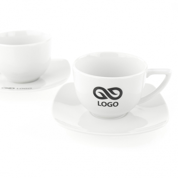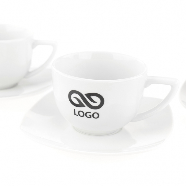 Waga: 430 g / Wysokość: 60 mm / Średnica: góra 85 mm, dół 40 mm / Rozmiar nadruku: filiżanka zewnątrz 45 x 25 mm, filiżanka wewnątrz 50 x 5 mm, talerzyk 70 x 25 mm / Pojemność: 190 ml / Tworzywo: porcelana / Opakowanie: 20 szt. / Kolor: biały /